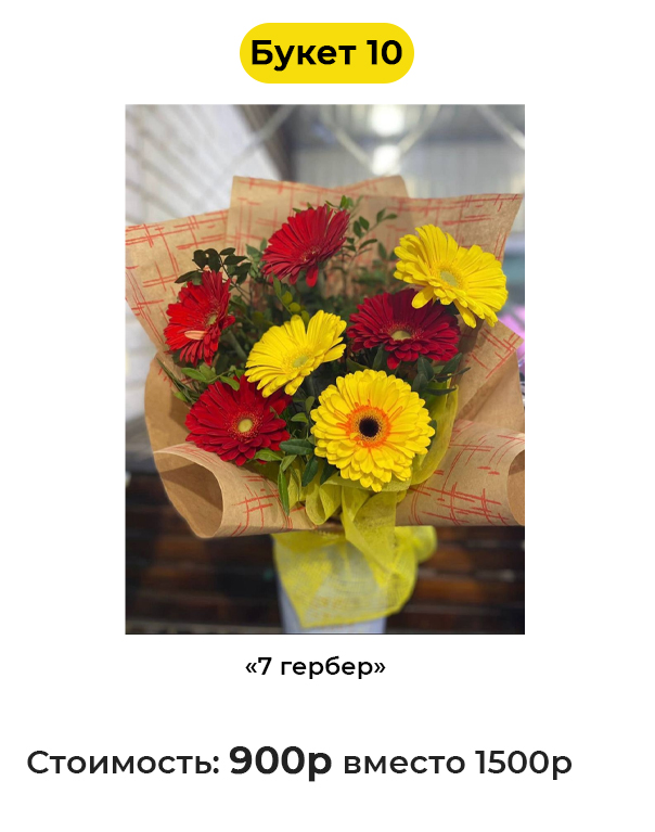 • Букет 10 «7 гербер» - 900 руб. вместо 1500 руб. (Купон за 89 руб.)